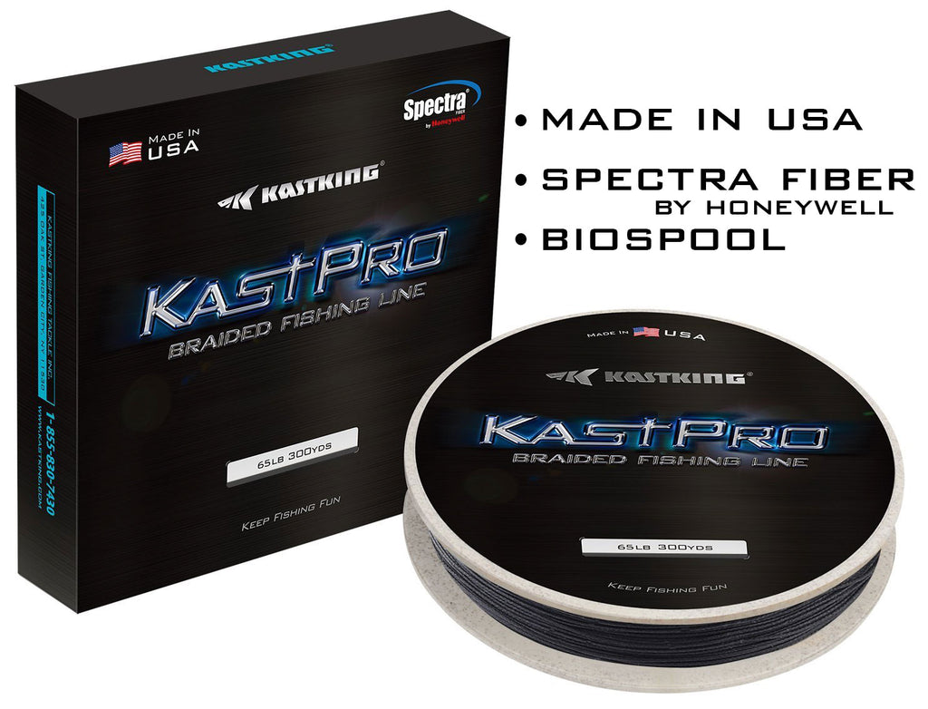 We are very proud of our KastPro Braid fishing line and it is, in fact, proudly made in the USA using the highest possible ISO 9001 and Aerospace AS9100 standards. KastPro braided line is made using 4-carrier (strand), Spectra fibers and is available in 5 popular colors including Black, Coastal Blue, Combat Green, Hi Viz Yellow and Ultra Pink. Each color is available in breaking strengths from 8-80 lbs and in both 150 yard and 300 yard spools.