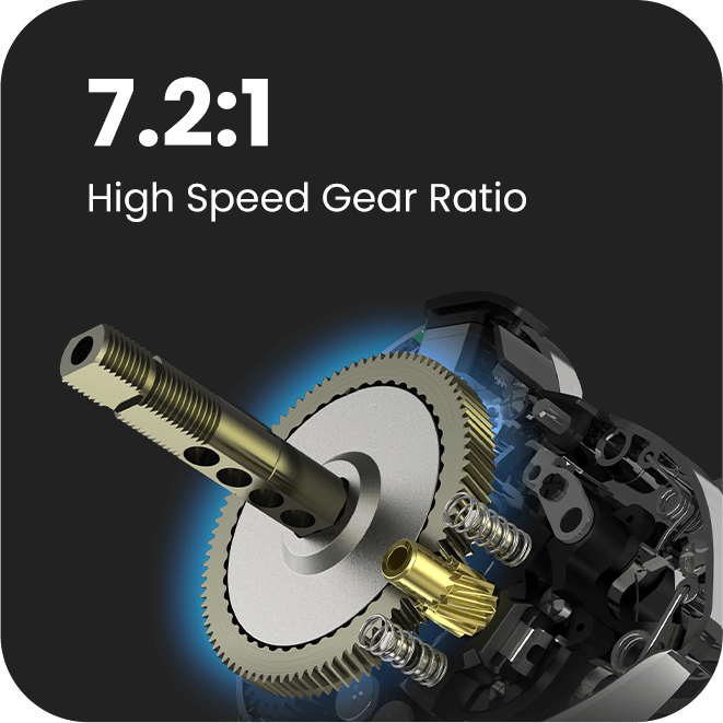 The 7.2:1 gear ratio is ideal for a variety of popular fishing techniques, including topwater lures, jerkbaits, jigs and more. The high gear ratio is useful when anglers need to get the lures back to the boat in a hurry, particularly when getting fish away from docks, weeds and other cover.