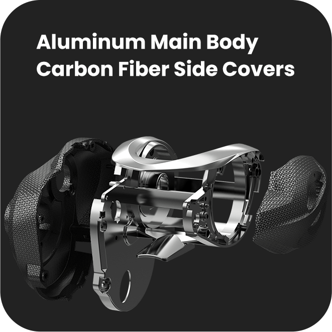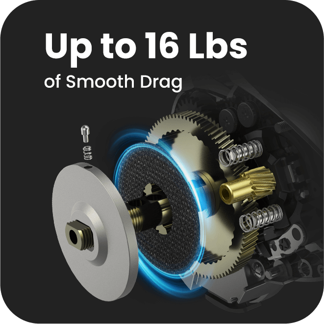 The carbon fiber drag washer, 7075 aluminum main gear and the brass pinion gear all work together to provide up to 16 pounds of smooth, fish-stopping power.