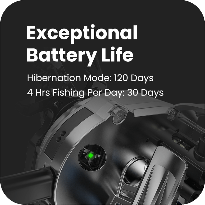 On a full charge the iReel One can be fished for 4 hours per day for 30 days. In standby mode, it can last up to 120 before charging is required.