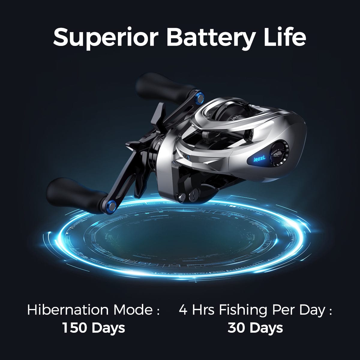 The iReel 2 fully charges in 2 hours and lasts 30 days with 4-hour fishing per day. It also has a longer hibernation mode of 150 days, with the iReel 2 entering sleep mode after 30 minutes of inactivity.