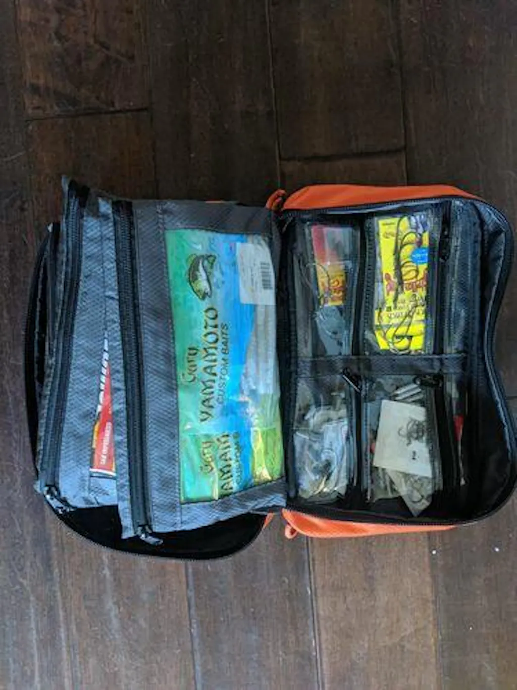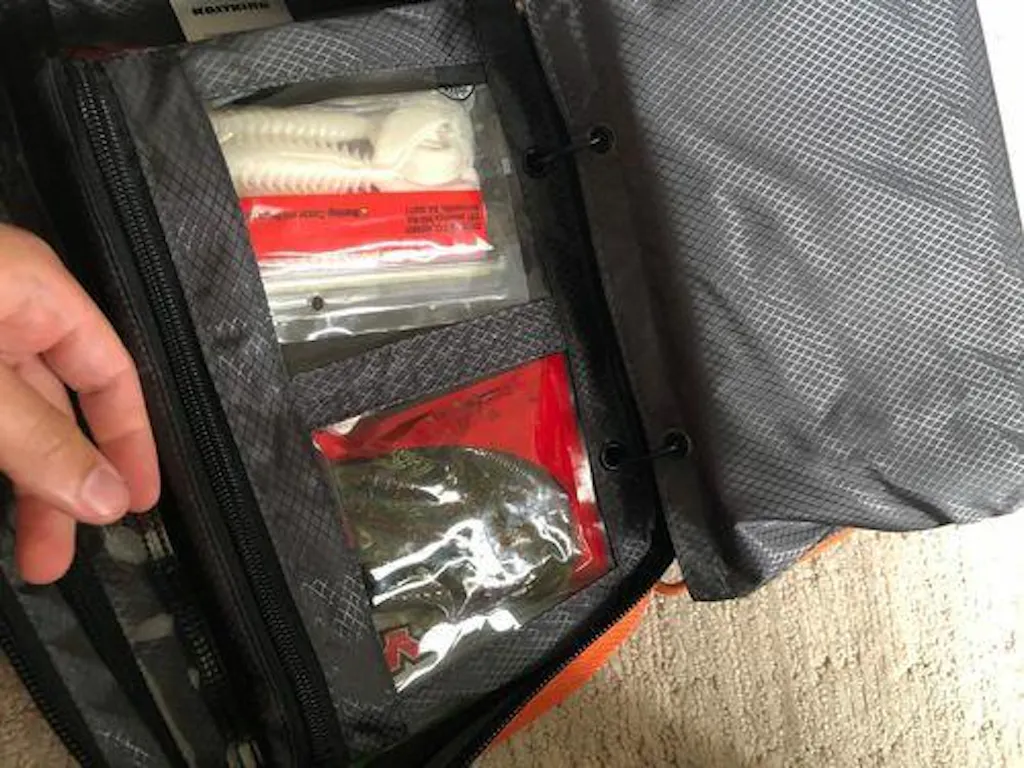 Six quick access bait sleeves provide abundant capacity for managing soft plastic baits such as worms, swim baits, and creature baits.  Zippered transparent pockets inside the front and rear covers provide a good location to store hooks, weights, snaps, swivels and other terminal tackle.