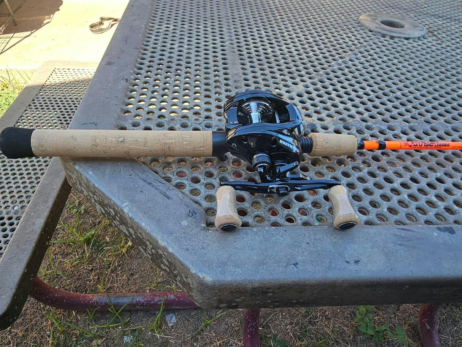 When I first saw the specs on this reel last year I was a little skeptical of the fact of a small graphite bait caster with 28.6lb. drag, so I ordered one along with a Gomexus carbon handle and a 7'6" Whisker Seeker.
