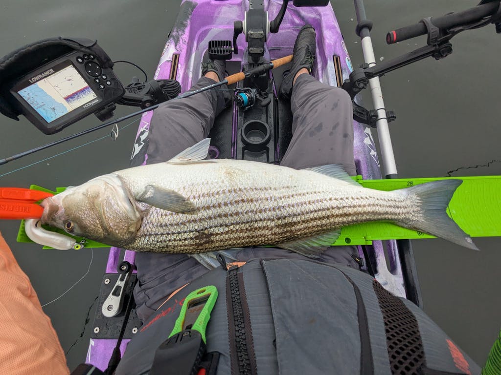First weekend out we came upon a school of slot-sized stripers and I was able to land 7 or 8 in the kayak throwing an 8" paddle tail. Fun times!
